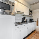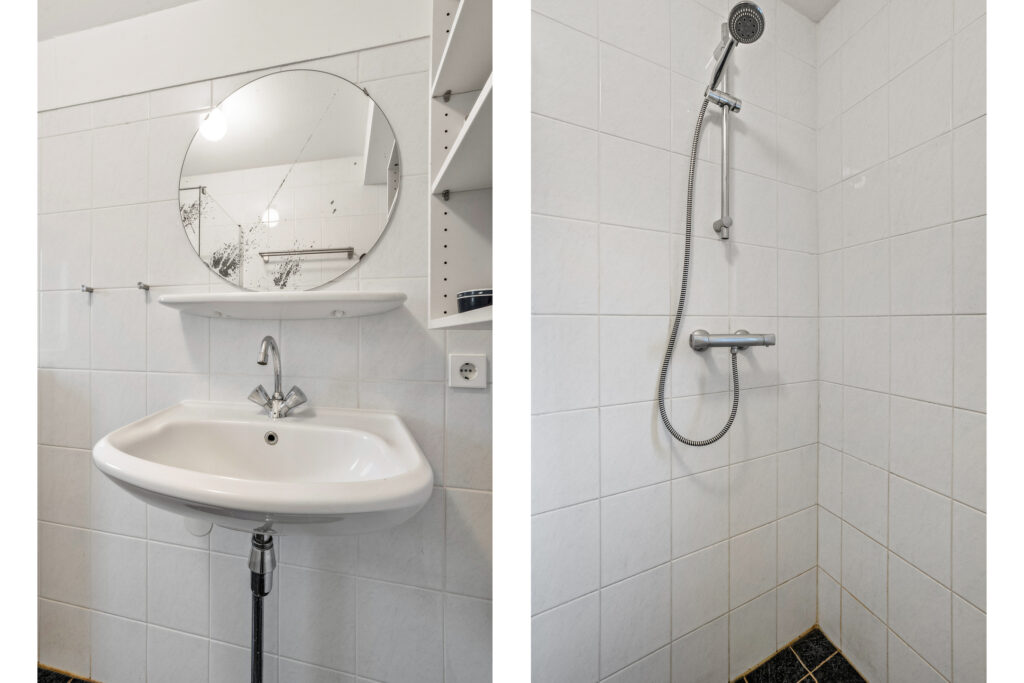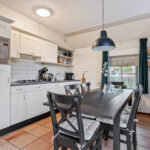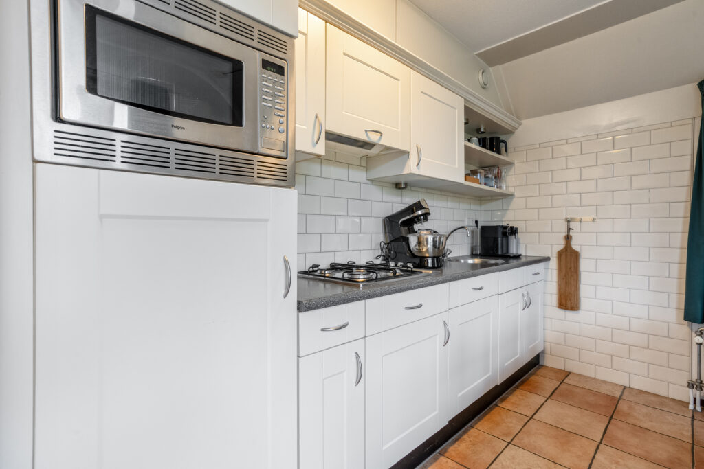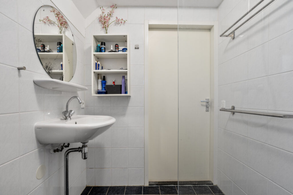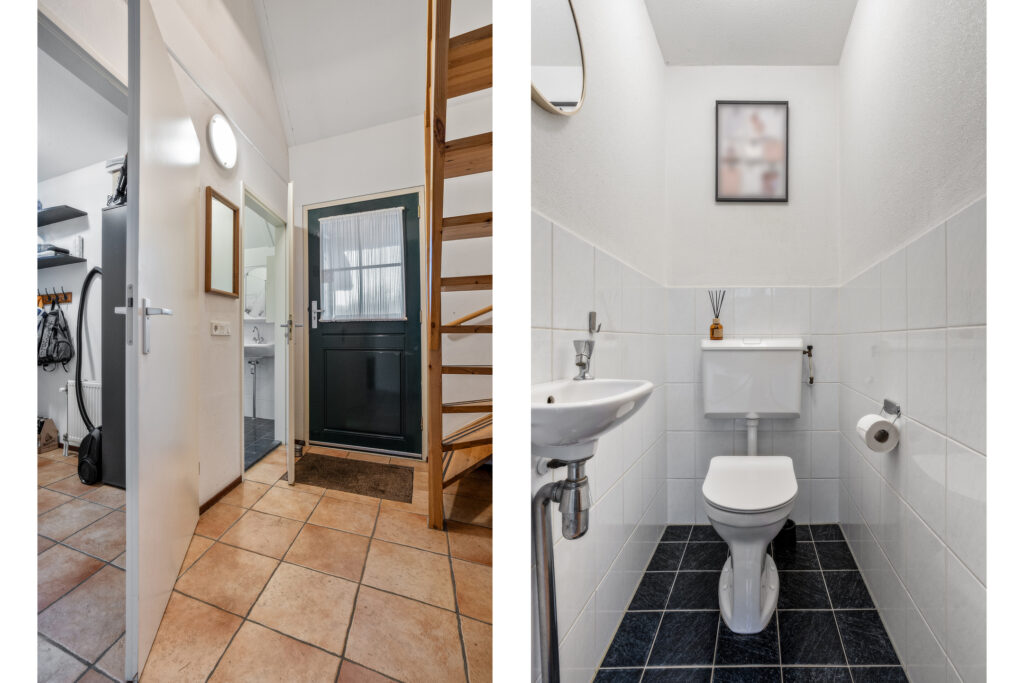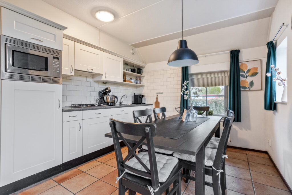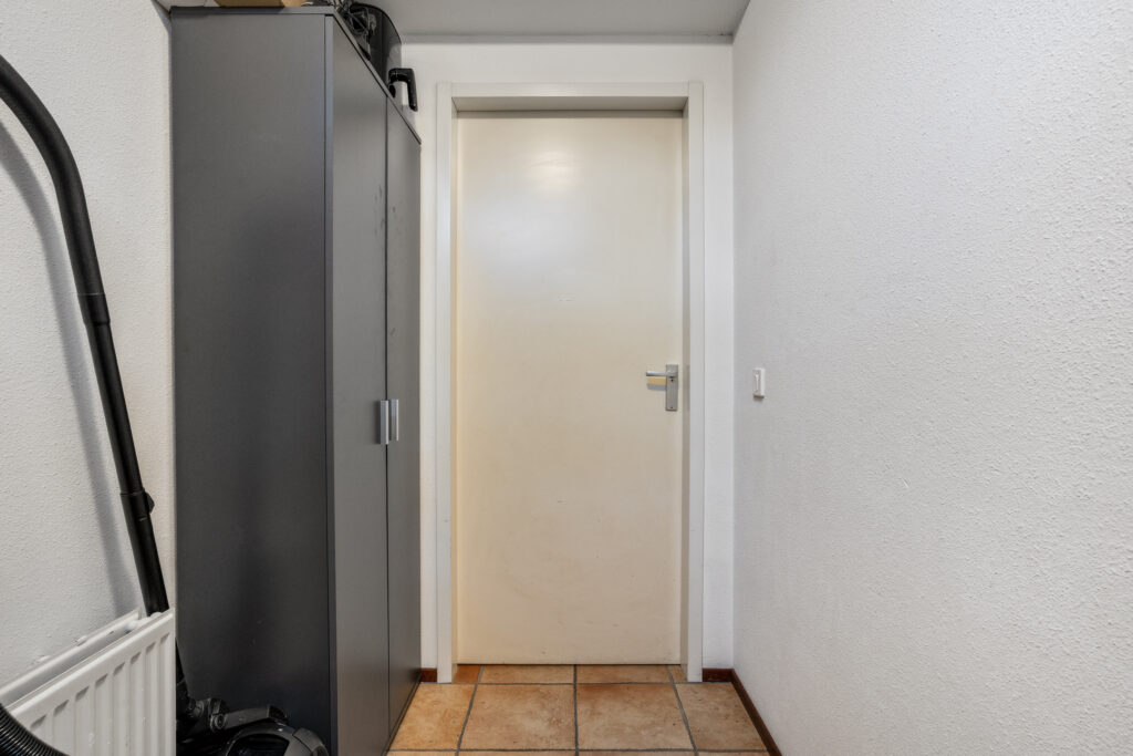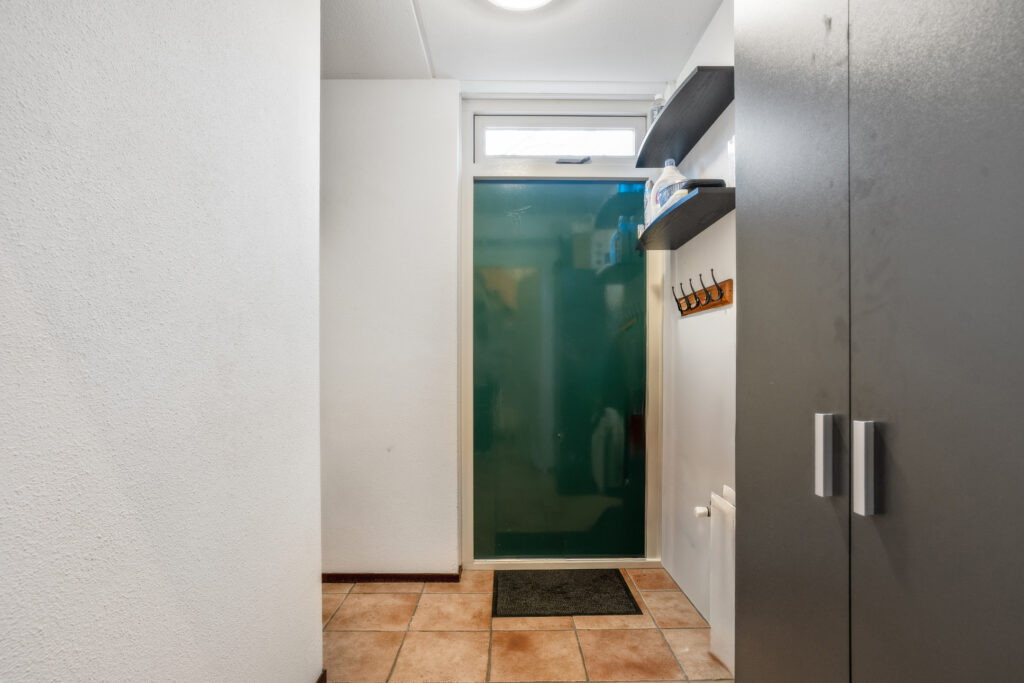Buitenom is een praktische bijkeuken te bereiken, waar de witgoedaansluiting is gesitueerd. Tevens is hier ruimte om twee fietsen te stallen.