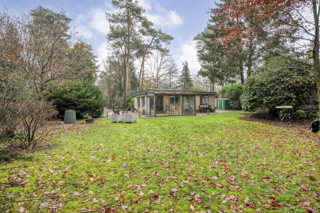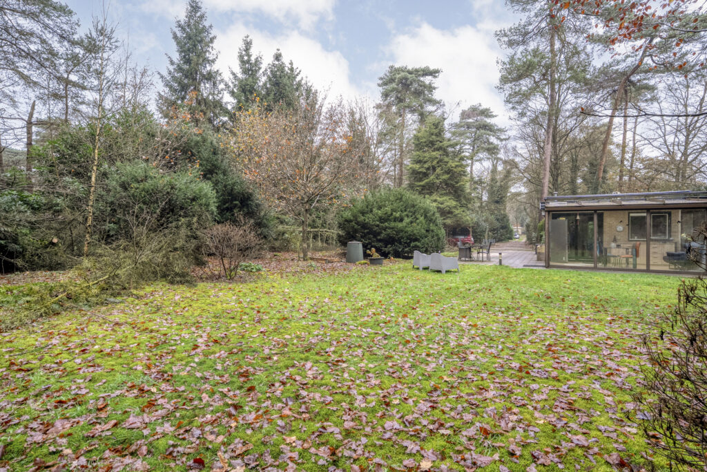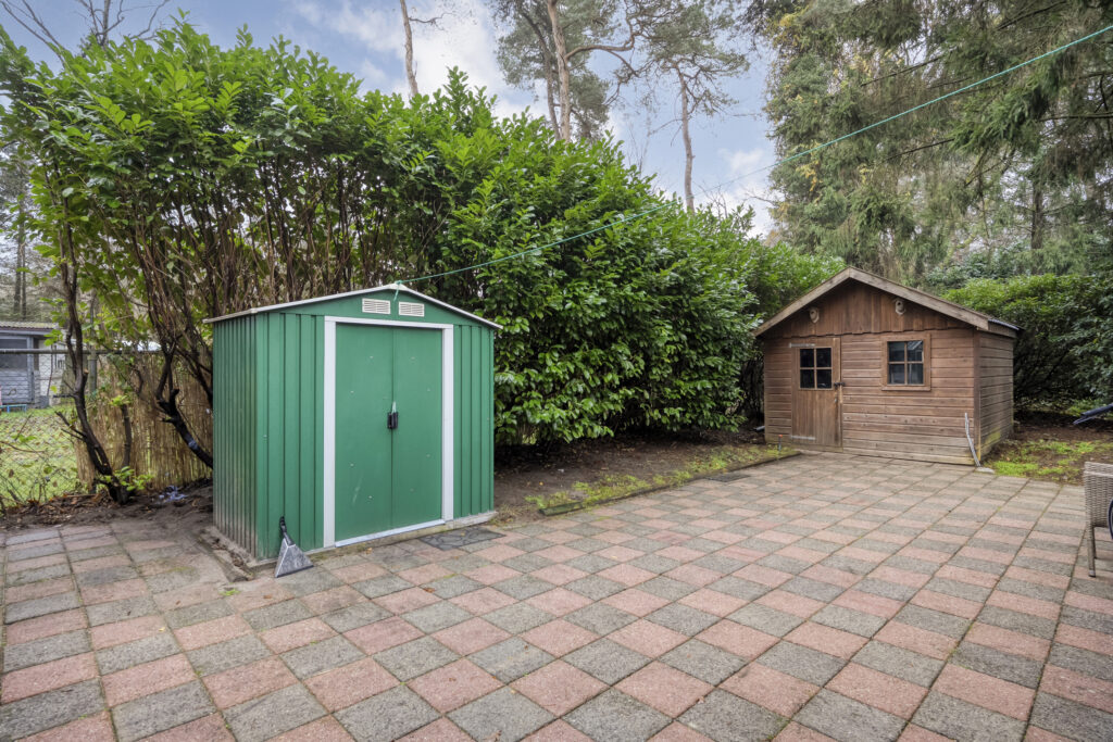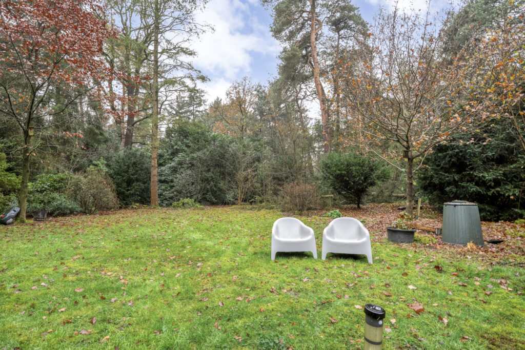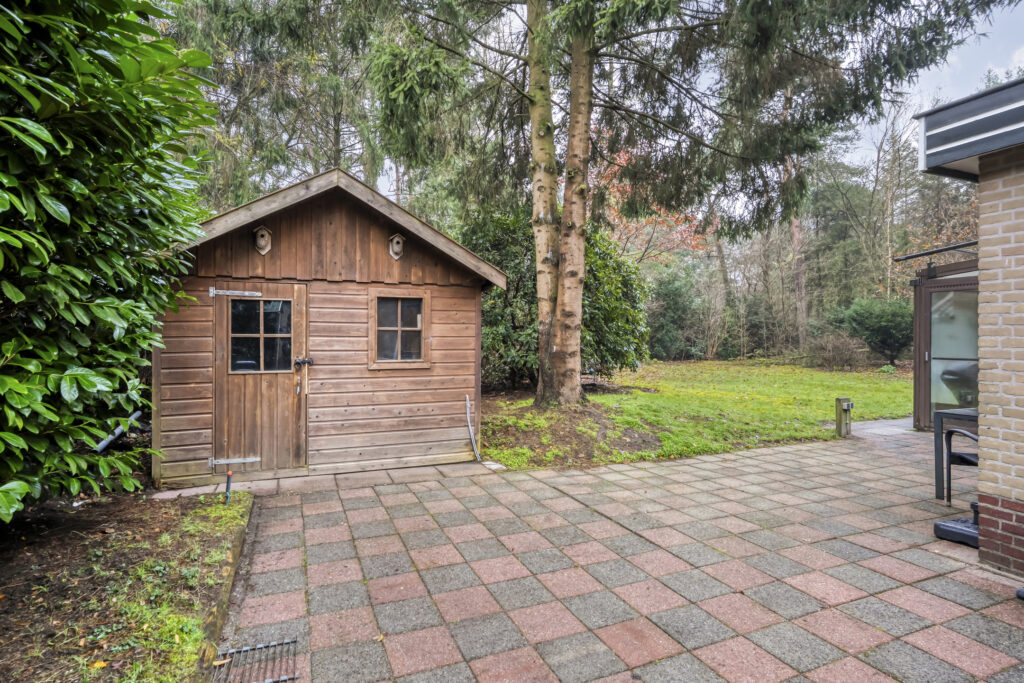Buiten: Afgesloten entree door middel van een hekwerk, ruime tuin rondom de woning met terrassen. Bosrijke tuin met elektrapunten en een vrijstaande houten berging met elektra.