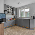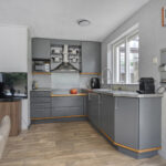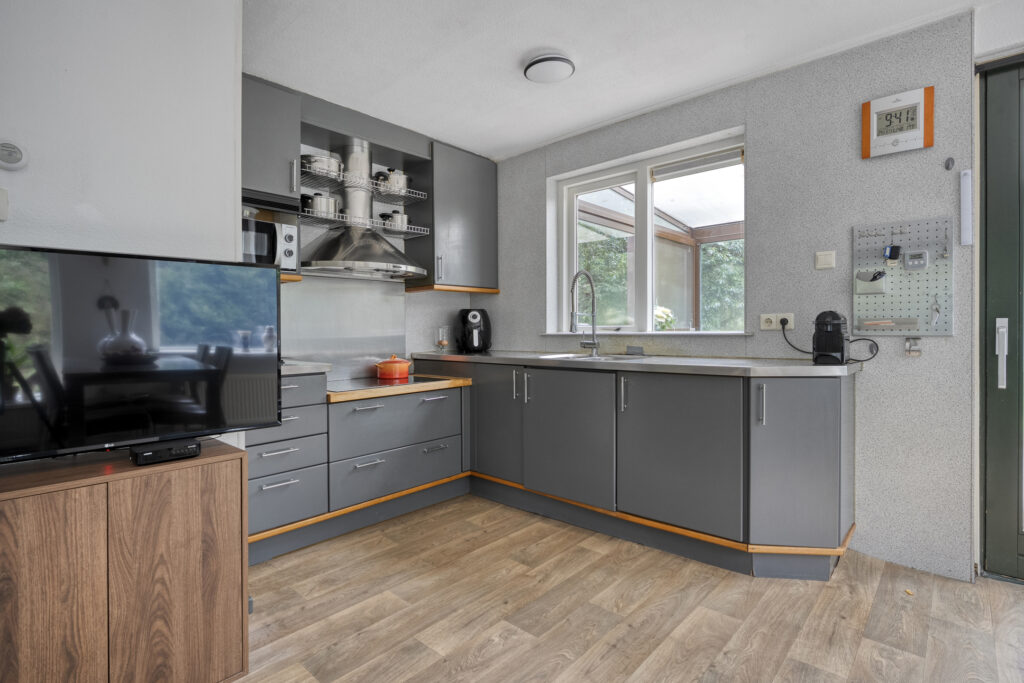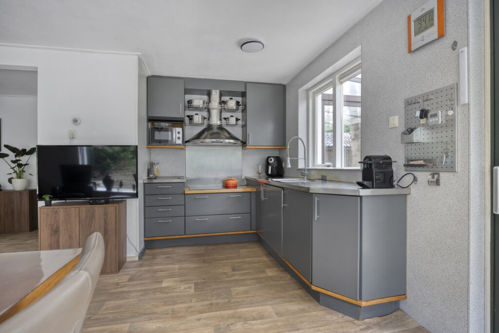 De keuken met hoekopstelling is voorzien van een elektrische kookplaat, spoelbak, koelkast en losse magnetron.